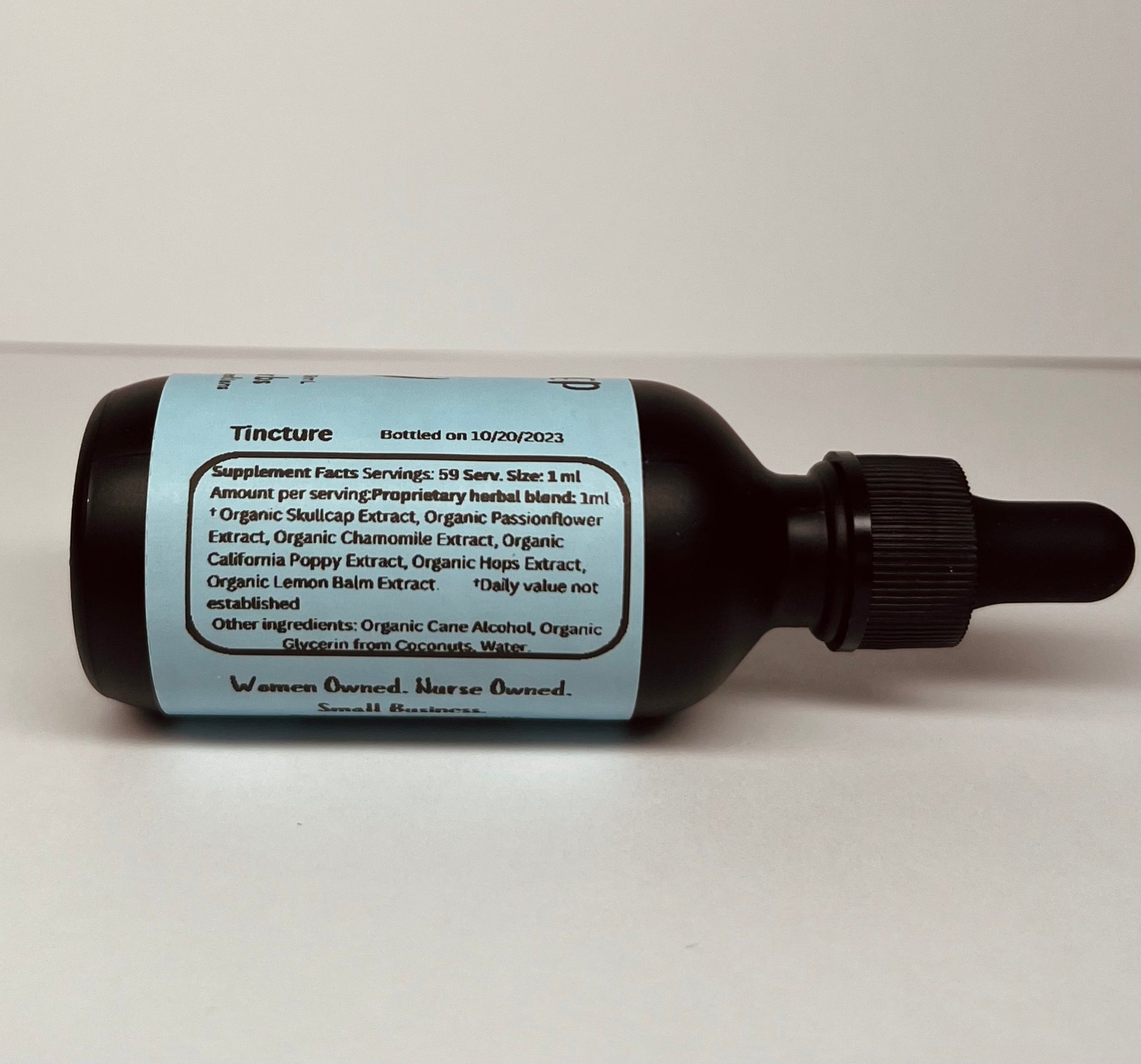 INGREDIENTS: Organic Cane Alcohol, Organic Vegetable Glycerin from Coconuts, Organic Skullcap. Extract, Organic Passionflower Extract, Organic Chamomile Extract, Organic Lemon Balm Extract, Organic Hops Extract, Organic California Poppy Extract.