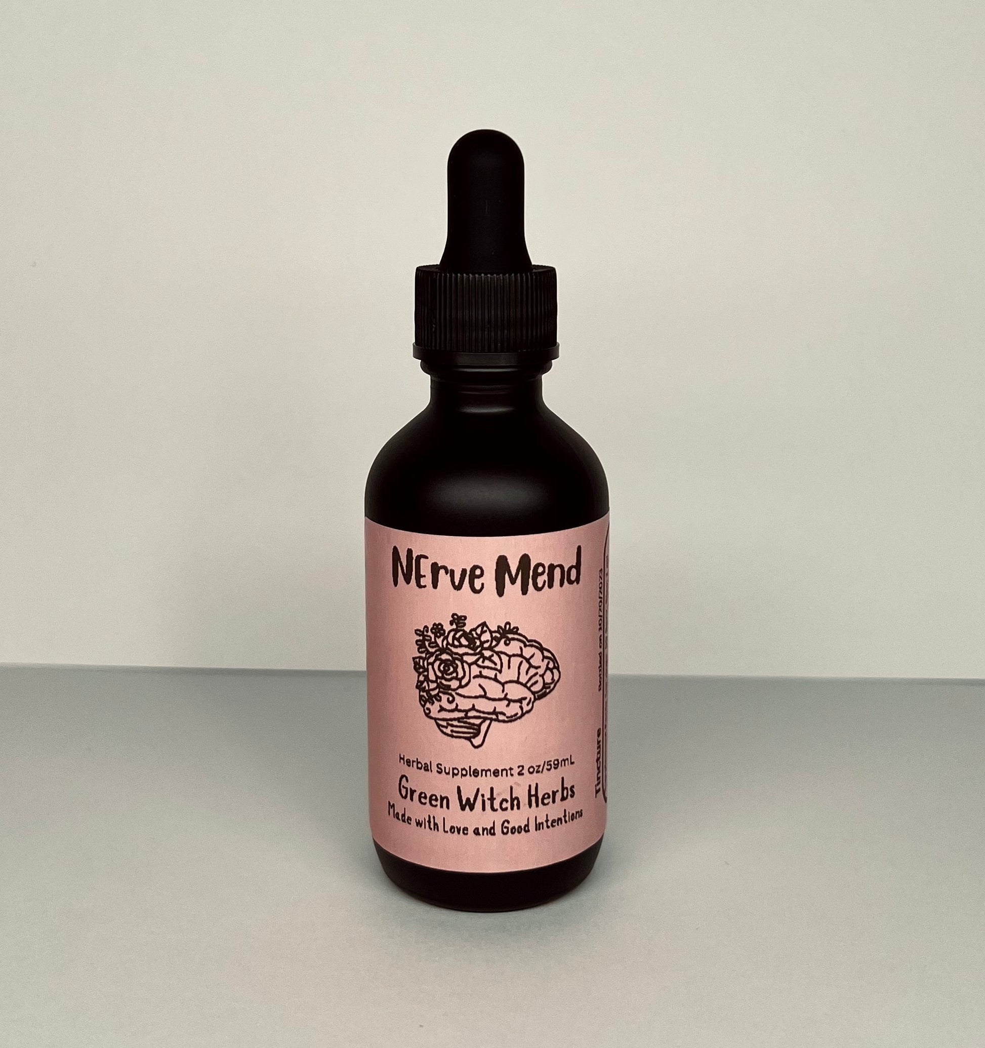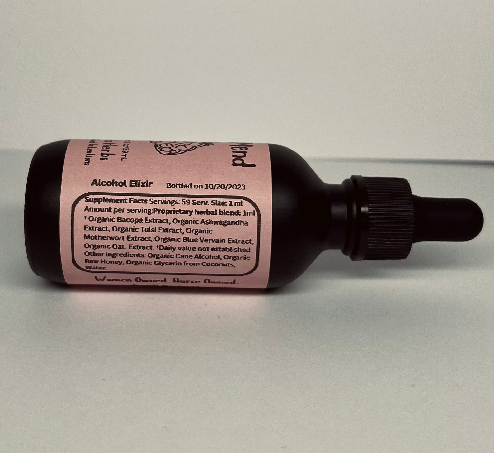 Nerve Mend Elixir is made of herbs to nourish and build resiliency to stress and anxiety. With adaptogenic properties, Ashwagandha root lowers stress levels and improves energy. Bacopa energizes the nervous system while Tulsi uplifts and increases focus. The relaxing properties of Motherwort help to calm overwhelmed minds.
